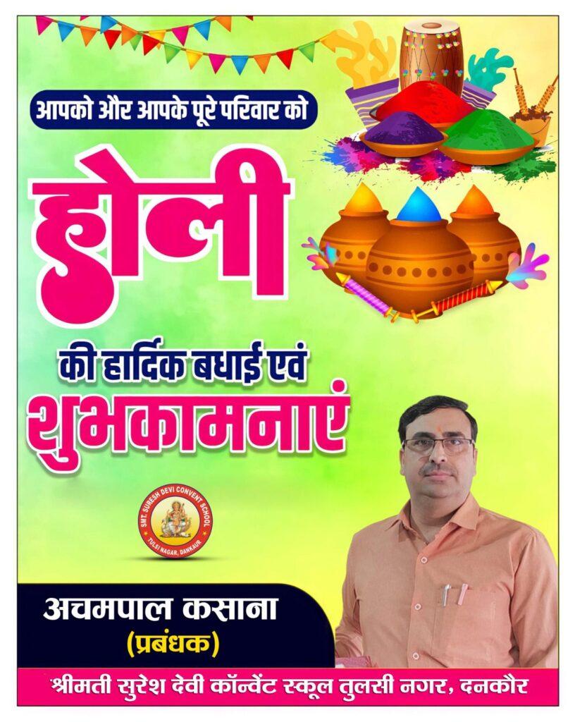 अचमपाल कसाना- प्रबंधक श्रीमती सुरेश देवी कान्वेंट स्कूल तुलसीनगर, दनकौर की ओर से रंगों के पर्व होली की सभी क्षेत्रवासियों को हार्दिक शुभकामनाएं