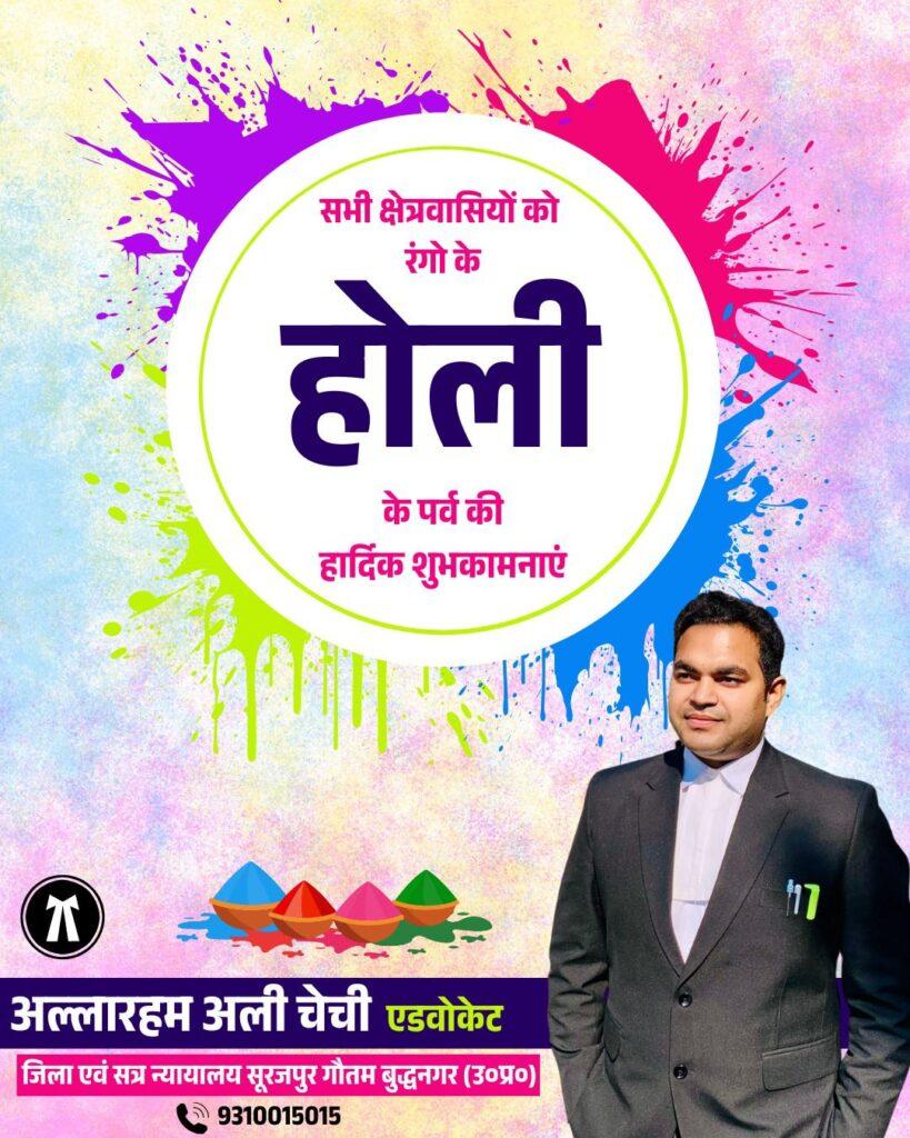 अल्लाह रहम अली चेची एडवोकेट- जिला एवं सत्र न्यायालय सूरजपुर गौतमबुद्धनगर (उत्तर प्रदेश) की ओर से रंगों के पर्व होली की सभी क्षेत्रवासियों को हार्दिक शुभकामनाएं