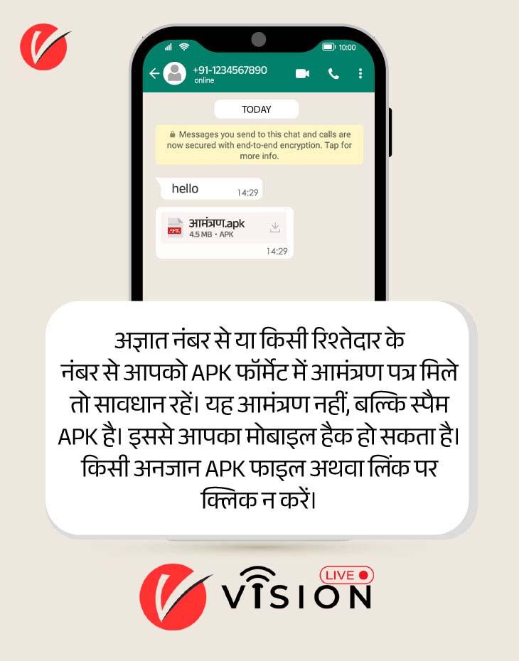 हाल के दिनों में एक नया साइबर फ्रॉड तेजी से फैल रहा है जिसमें हैकर्स शादी/इवेंट कार्ड के रूप में फेक संदेश भेजकर एक .apk फ़ाइल डाउनलोड कराते हैं। फ़ाइल इंस्टॉल होते ही उपयोगकर्ता का मोबाइल हैक हो जाता है और हैकर उसके व्हाट्सएप से स्पैम/ब्लैकमेल संदेश भेजने लगते हैं। पुलिस और साइबर सुरक्षा विशेषज्ञों ने इसे गंभीर बताया है और लोगों को सतर्क रहने की चेतावनी दी है।