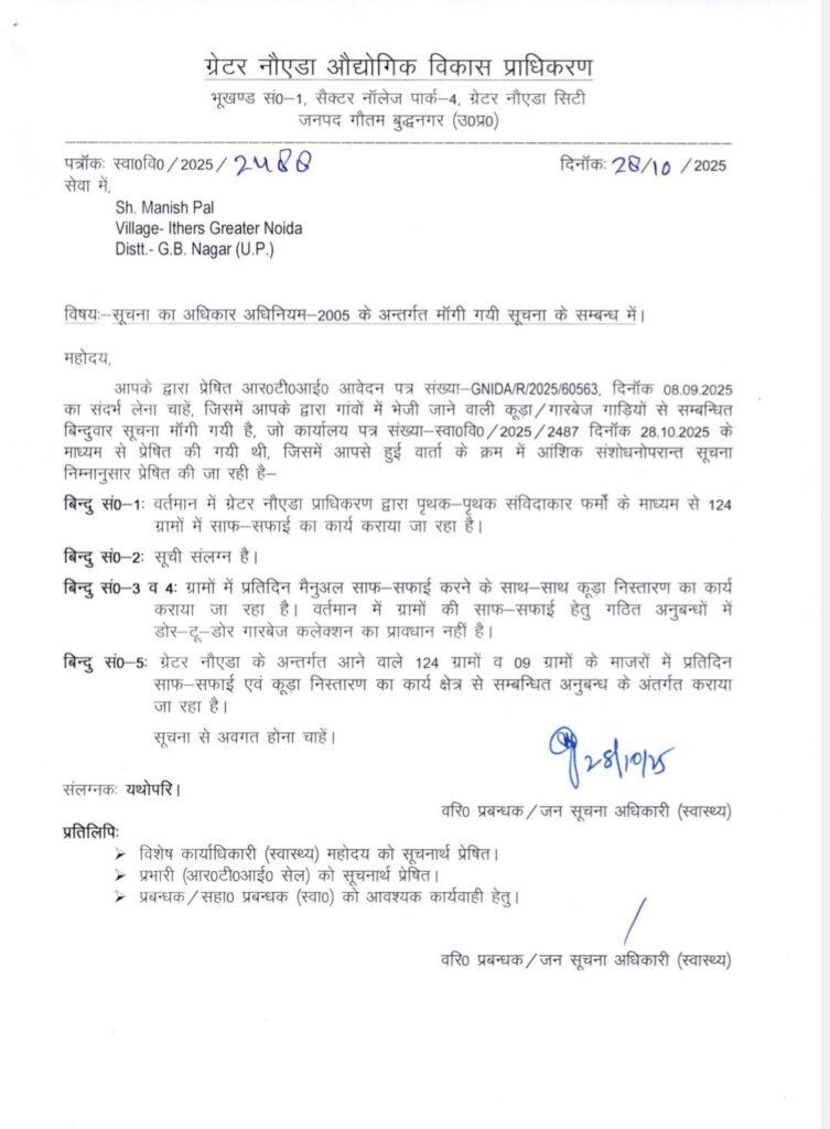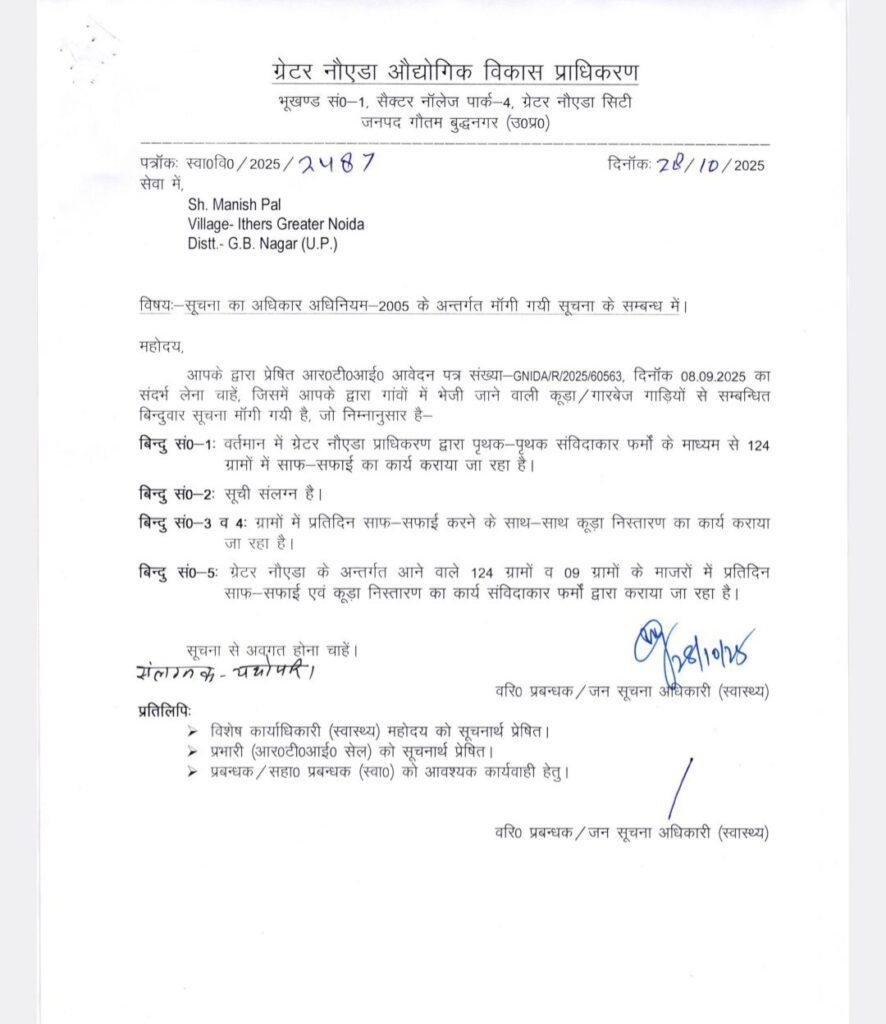 28 अक्टूबर 2025 को ग्रेटर नोएडा औद्योगिक विकास प्राधिकरण (GNIDA) के वरिष्ठ प्रबंधक एवं जन सूचना अधिकारी (स्वास्थ्य) द्वारा जारी आधिकारिक पत्र (संख्या – स्वा०वि०/2025/2487 व 2488) में यह स्पष्ट कहा गया है कि