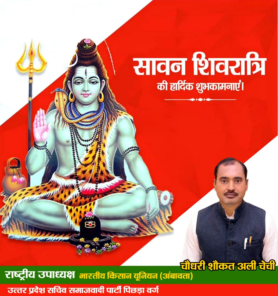 चौधरी शौकत अली चेची राष्ट्रीय उपाध्यक्ष भारतीय किसान यूनियन (अंबावता)/ उत्तर प्रदेश सचिव समाजवादी पार्टी पिछड़ा वर्ग की ओर से सावन शिवरात्रि की हार्दिक शुभकामनाएं