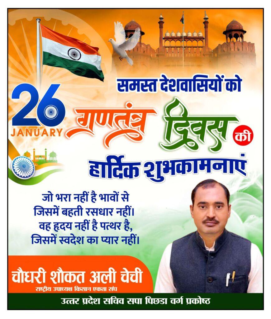 चौधरी शौकत अली चेची- राष्ट्रीय उपाध्यक्ष किसान एकता संघ/ उत्तर प्रदेश सचिव सपा पिछड़ा वर्ग प्रकोष्ठ की ओर से गणतंत्र दिवस की सभी क्षेत्रवासियों को हार्दिक शुभकामनाएं