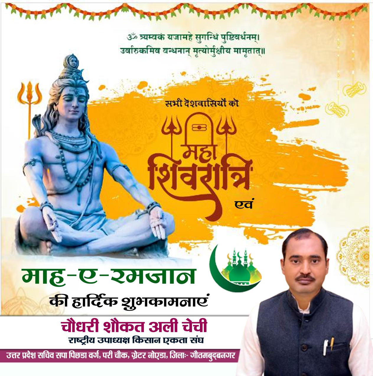 चौधरी शौकत अली चेची राष्ट्रीय उपाध्यक्ष किसान एकता संघ/ उत्तर प्रदेश सचिव सपा पिछडा वर्ग, परी चौक, ग्रेटर नोएडा, जिला:- गौतमबुद्बनगर की ओर से सभी को महाशिवरात्रि एवं माह-ए- रमजान की हार्दिक शुभकामनाएं