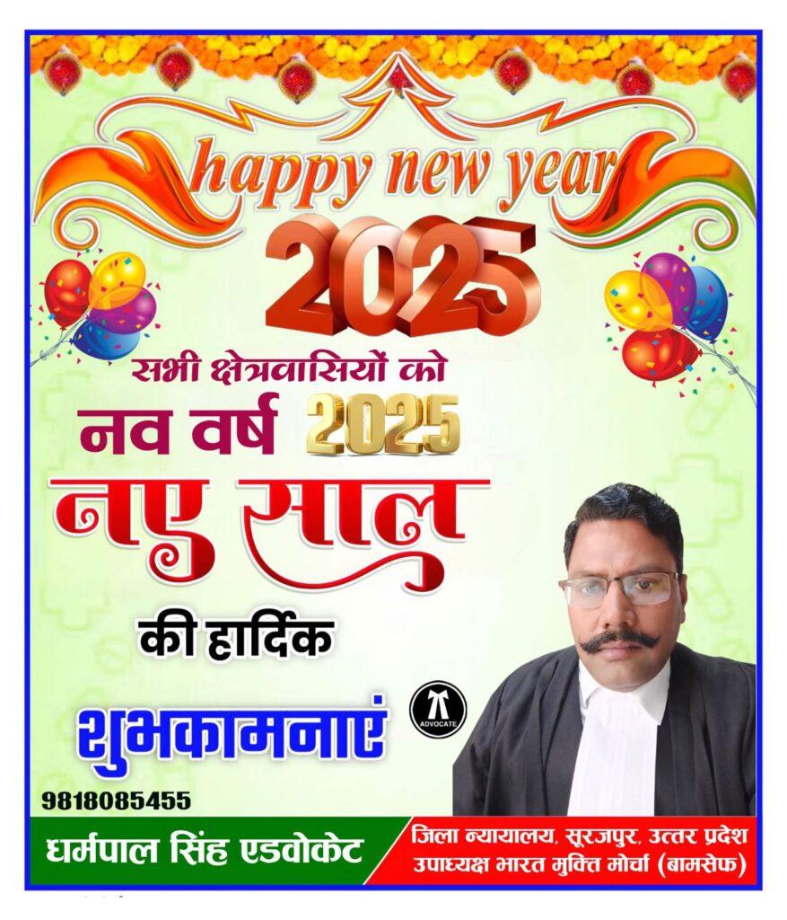 धर्मपाल सिंह एडवोकेट- उत्तर प्रदेश- उपाध्यक्ष भारत मुक्ति मोर्चा( बामसेफ), जिला एवं सत्र न्यायालय सूरजपुर गौतमबुद्धनगर की ओर से नव वर्ष 2025 की सभी क्षेत्रवासियों को हार्दिक शुभकामनाएं