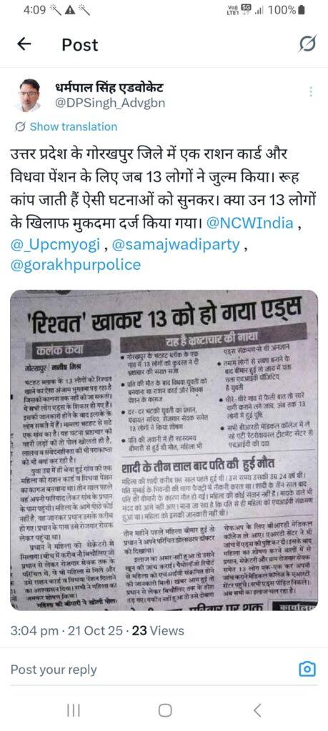 सोशल मीडिया प्लेटफॉर्म ‘एक्स’ (पूर्व ट्विटर) पर यह मुद्दा उठाते हुए भारत मुक्ति मोर्चा के उत्तर प्रदेश उपाध्यक्ष और गौतम बुद्ध नगर के अधिवक्ता धर्मपाल सिंह ने मुख्यमंत्री योगी आदित्यनाथ, गोरखपुर पुलिस, राष्ट्रीय महिला आयोग और समाजवादी पार्टी को टैग करते हुए मांग की है कि यदि ऐसी घटना वास्तव में हुई है तो दोषियों के खिलाफ सख्त और पारदर्शी कार्रवाई की जाए।
