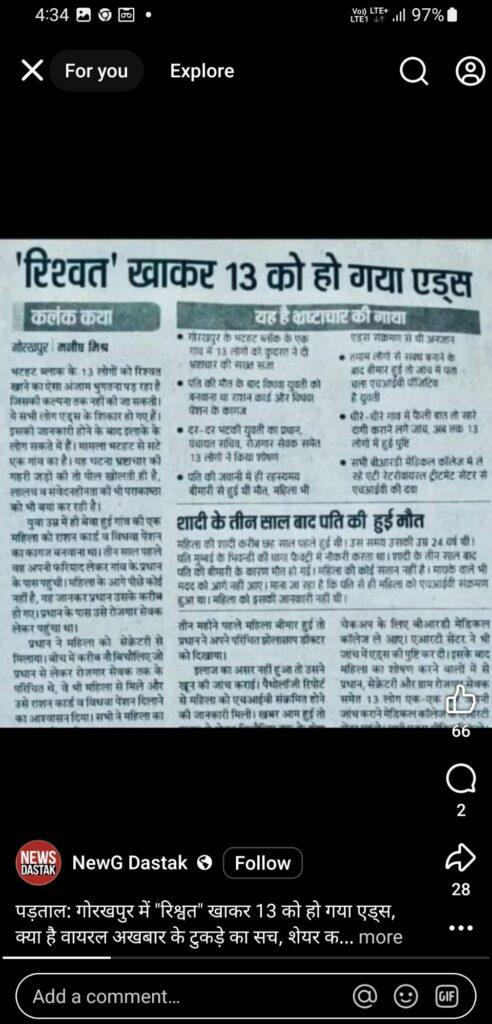 सोशल मीडिया पर पिछले कुछ दिनों से एक चौंकाने वाली खबर तेजी से वायरल हो रही है, जिसमें दावा किया जा रहा है कि उत्तर प्रदेश के गोरखपुर जिले के भटहट ब्लॉक में “राशन कार्ड और विधवा पेंशन बनवाने के नाम पर रिश्वत लेने वाले 13 लोग एड्स के शिकार हो गए।” खबर के साथ कुछ अखबारों की पुरानी कतरनें भी साझा की जा रही हैं, जिनमें यह पूरा घटनाक्रम “रिश्वत खाकर 13 को हुआ एड्स” शीर्षक के साथ छपा बताया जा रहा है।