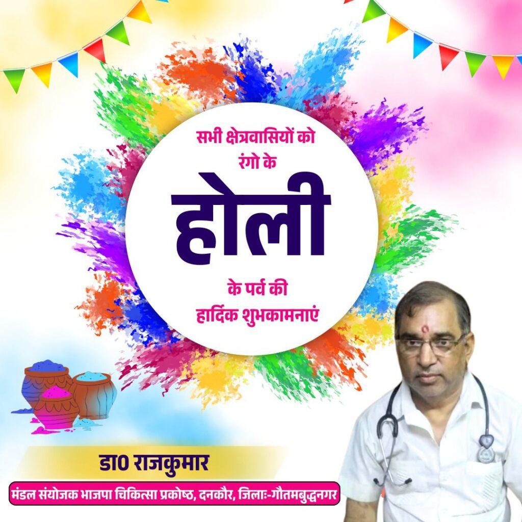 डॉ राजकुमार -मंडल संयोजक भाजपा चिकित्सा प्रकोष्ठ दनकौर, जिला:- गौतमबुद्धनगर की ओर से रंगों के पर्व होली की सभी क्षेत्रवासियों को हार्दिक शुभकामनाएं