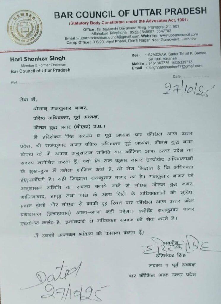 उन्होंने आगे कहा कि “राजकुमार नागर एडवोकेट के अनुशासन समिति में शामिल होने से नोएडा, गौतम बुद्ध नगर, गाजियाबाद, हापुड़ और आसपास के जिलों के अधिवक्ताओं को बड़ी सुविधा मिलेगी। अब अधिवक्ताओं को बार काउंसिल प्रयागराज (इलाहाबाद) के चक्कर नहीं लगाने पड़ेंगे।”
