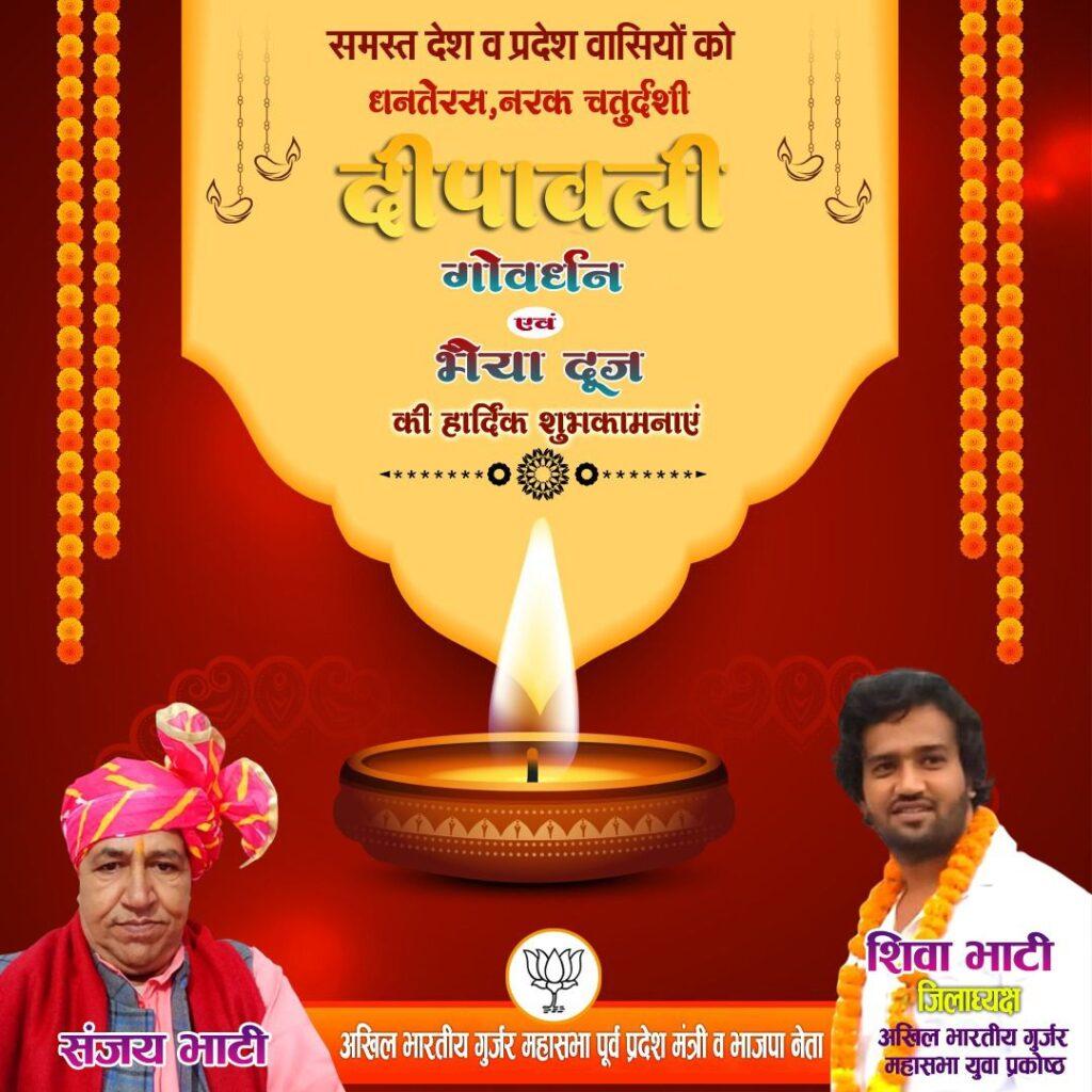 अखिल भारतीय गुर्जर महासभा के पूर्व प्रदेश मंत्री संजय भाटी व जिला अध्यक्ष शिवा भाटी की ओर से धनतेरस, नरक चतुर्दशी, दीपावली, गोवर्धन और भैया दूज की हार्दिक शुभकामनाएं