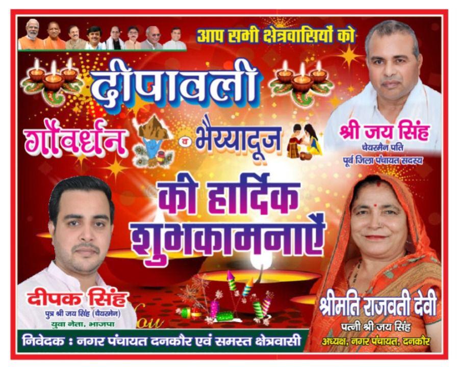 नगर पंचायत चैयरमैन दनकौर श्रीमती राजवती देवी/ प्रतिनिधि दीपक सिंह उर्फ दीपक भैया और समस्त सभासदगणों की ओर से धनतेरस, नरक चतुर्दशी, दीपावली, गोवर्धन और भैया दूज की हार्दिक शुभकामनाएं