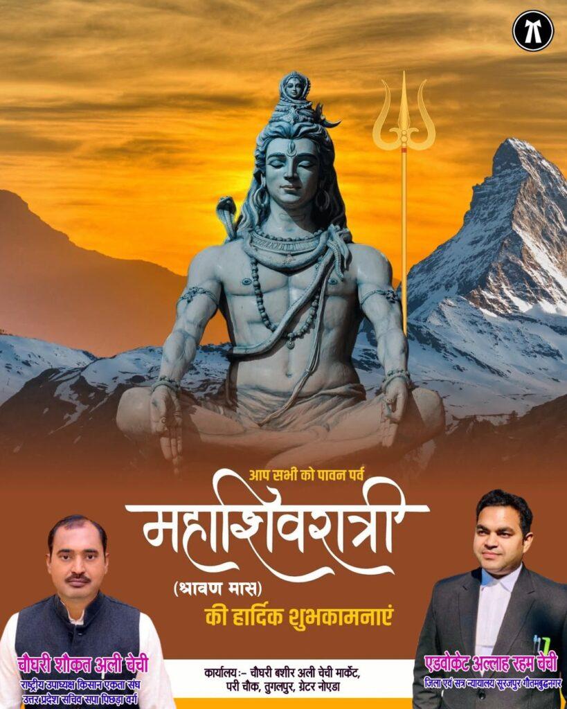 महाशिवरात्रि पर्व (श्रावण मास) की सभी क्षेत्रवासियों को हार्दिक शुभकामनाएं निवेदक 1:- एडवोकेट अल्लाह रहम चेची जिला एवं सत्र न्यायालय, सूरजपुर गौतमबुद्धनगर 2:- चौधरी शौकत अली चेची राष्ट्रीय उपाध्यक्ष किसान एकता संघ / उत्तर प्रदेश सचिव सपा पिछड़ा वर्ग कार्यालय :- चौधरी बशीर अली चेची मार्केट ,परी चौक ,तुगलपुर, ग्रेटर नोएडा