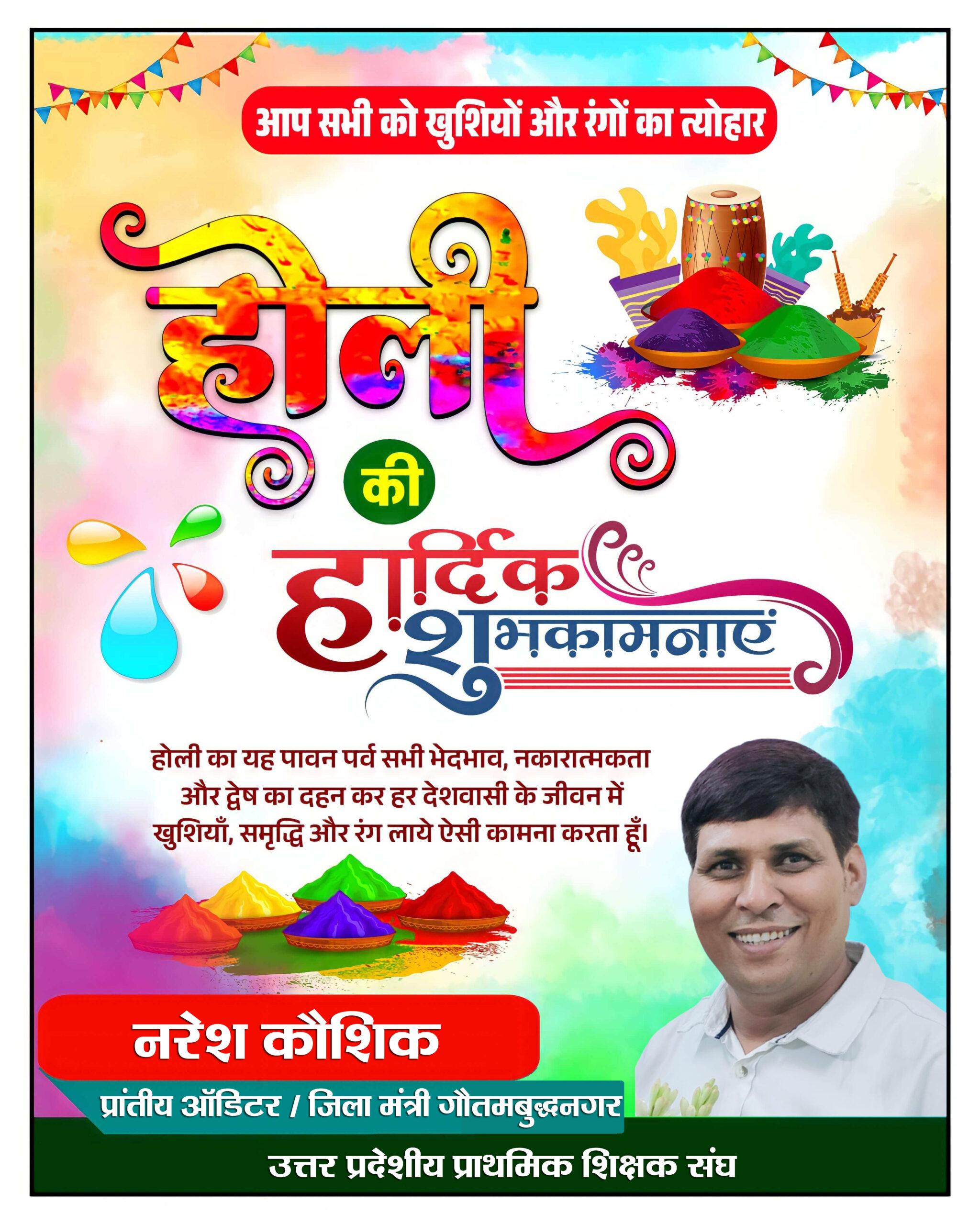 नरेश कौशिक प्रातीय ऑडिटर/ जिला महामंत्री, उत्तर प्रदेशीय प्राथमिक, शिक्षक संघ की ओर से रंगो के पर्व होली की सभी क्षेत्रवसियों को हार्दिक शुभकमानाएं