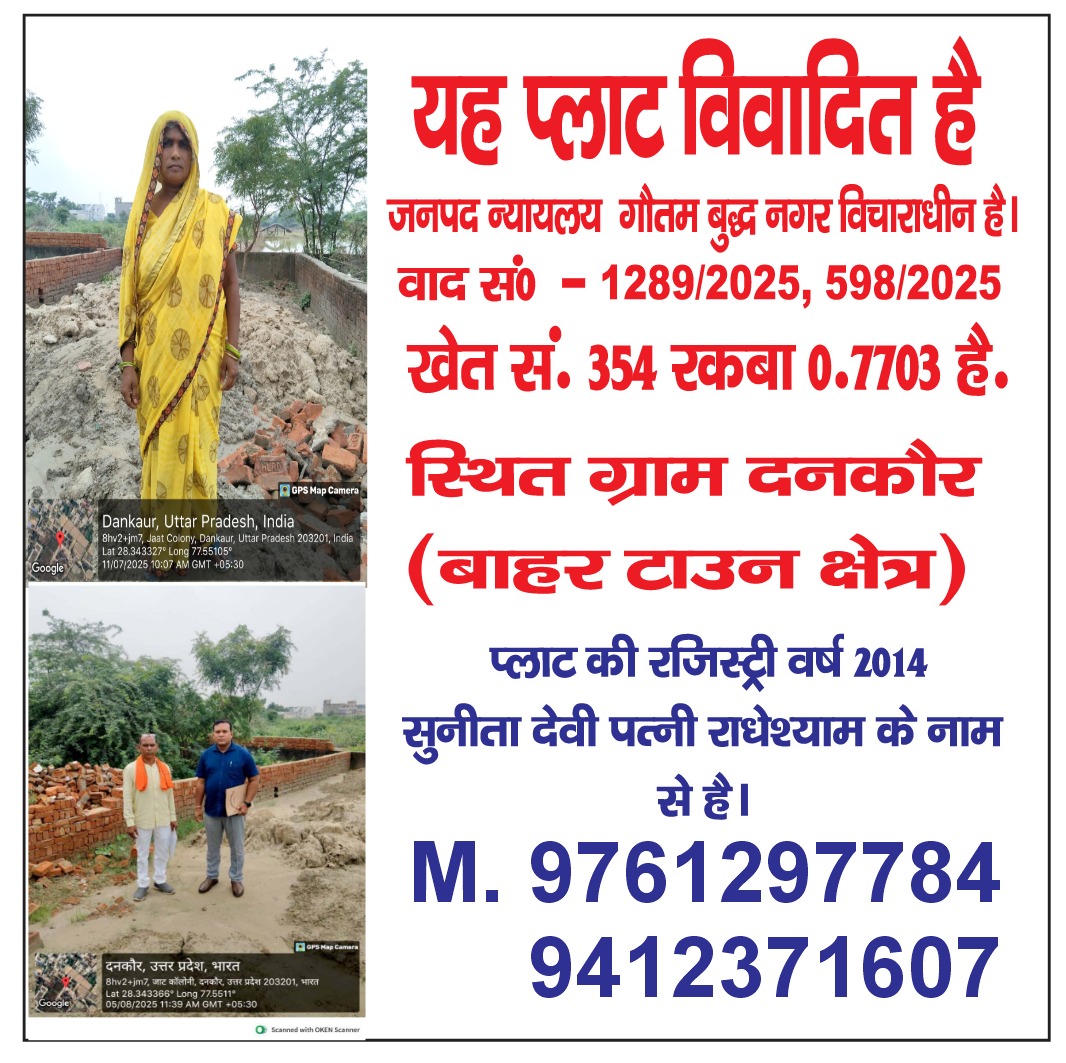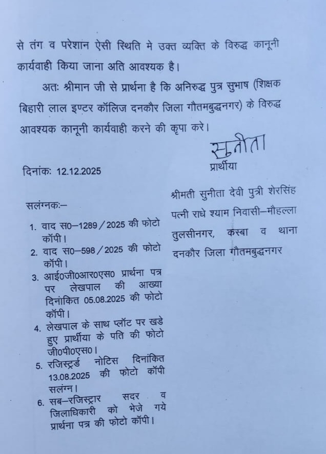 श्रीमती सुनीता देवी ने शिकायत में उल्लेख किया है कि उन्हें उनके पिता द्वारा ग्राम दनकौर स्थित खसरा संख्या 354 में 100 वर्गगज का आवासीय प्लॉट विधिवत पंजीकृत हिबानामा (दानपत्र) के माध्यम से प्राप्त हुआ है, जिस पर वह लंबे समय से शांतिपूर्ण कब्जे में हैं।