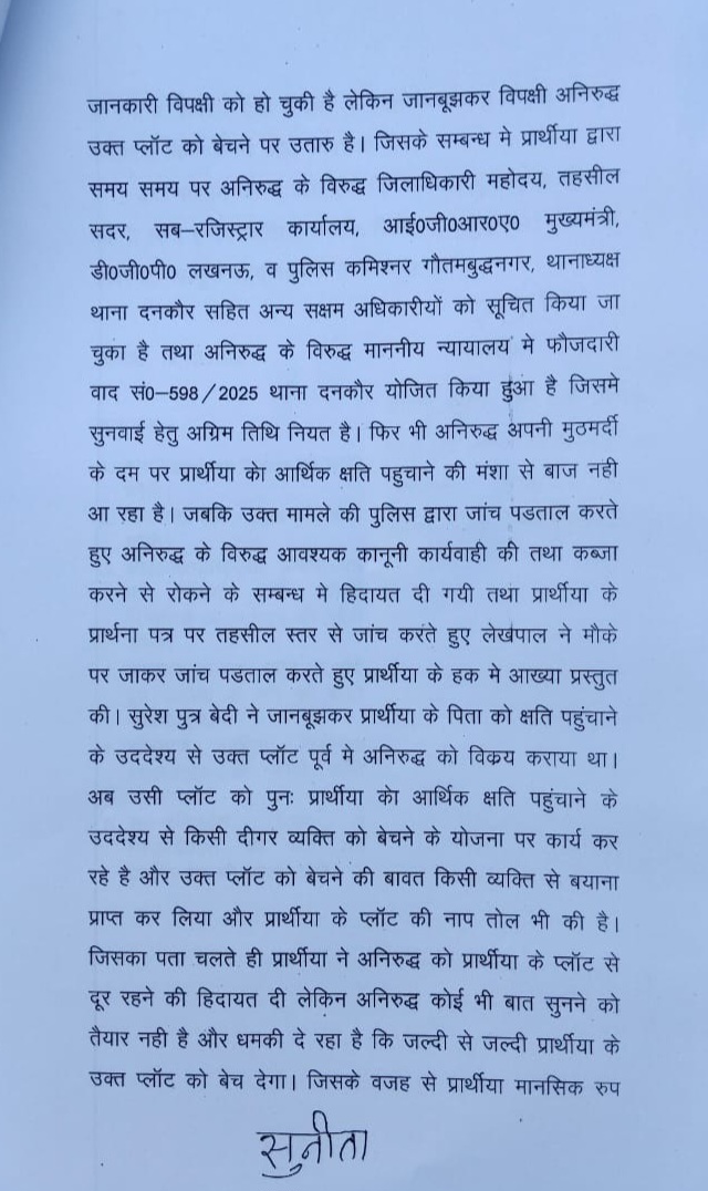 जनपद गौतमबुद्धनगर के दनकौर क्षेत्र में एक आवासीय प्लॉट को लेकर चल रहे विवाद में पीड़िता श्रीमती सुनीता देवी ने जिलाधिकारी को दिए गए अपने शिकायत पत्र में विपक्षी का स्पष्ट उल्लेख किया है।