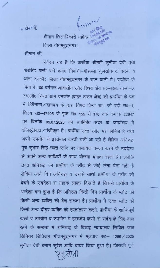 श्रीमती सुनीता देवी ने शिकायत में उल्लेख किया है कि उन्हें उनके पिता द्वारा ग्राम दनकौर स्थित खसरा संख्या 354 में 100 वर्गगज का आवासीय प्लॉट विधिवत पंजीकृत हिबानामा (दानपत्र) के माध्यम से प्राप्त हुआ है, जिस पर वह लंबे समय से शांतिपूर्ण कब्जे में हैं।