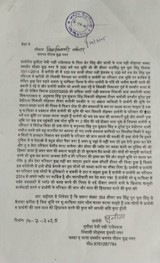 शिकायत पत्र के अनुसार, विपक्षी अनिरुद्ध पुत्र सुभाष सिंह, निवासी मोहल्ला टीचर कॉलोनी, कस्बा दनकौर, जनपद गौतमबुद्धनगर, बताए गए हैं। पीड़िता का दावा है कि उक्त व्यक्ति का उनके प्लॉट से कोई वैधानिक संबंध नहीं है, इसके बावजूद वह कथित रूप से भूमि पर अवैध कब्जे की नीयत से गतिविधियां कर रहा है।