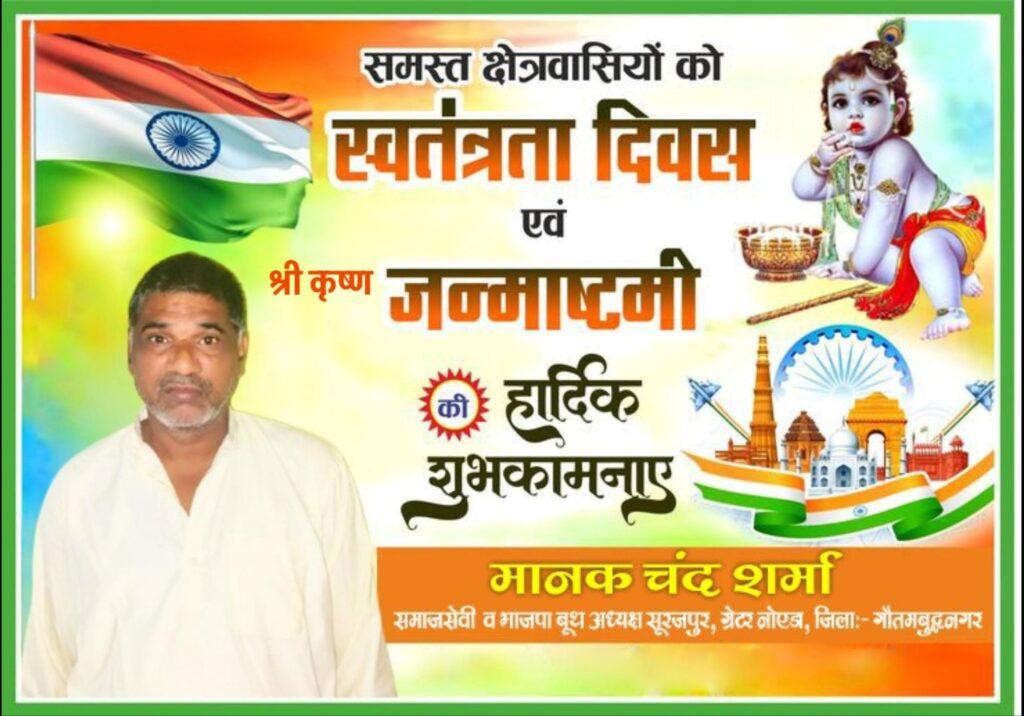 मानक चंद शर्मा (समाजसेवी) भाजपा बूथ अध्यक्ष सूरजपुर की ओर से स्वतंत्रता दिवस और श्री कृष्ण जन्माष्टमी की सभी क्षेत्रवासियों को हार्दिक शुभकामनाएं