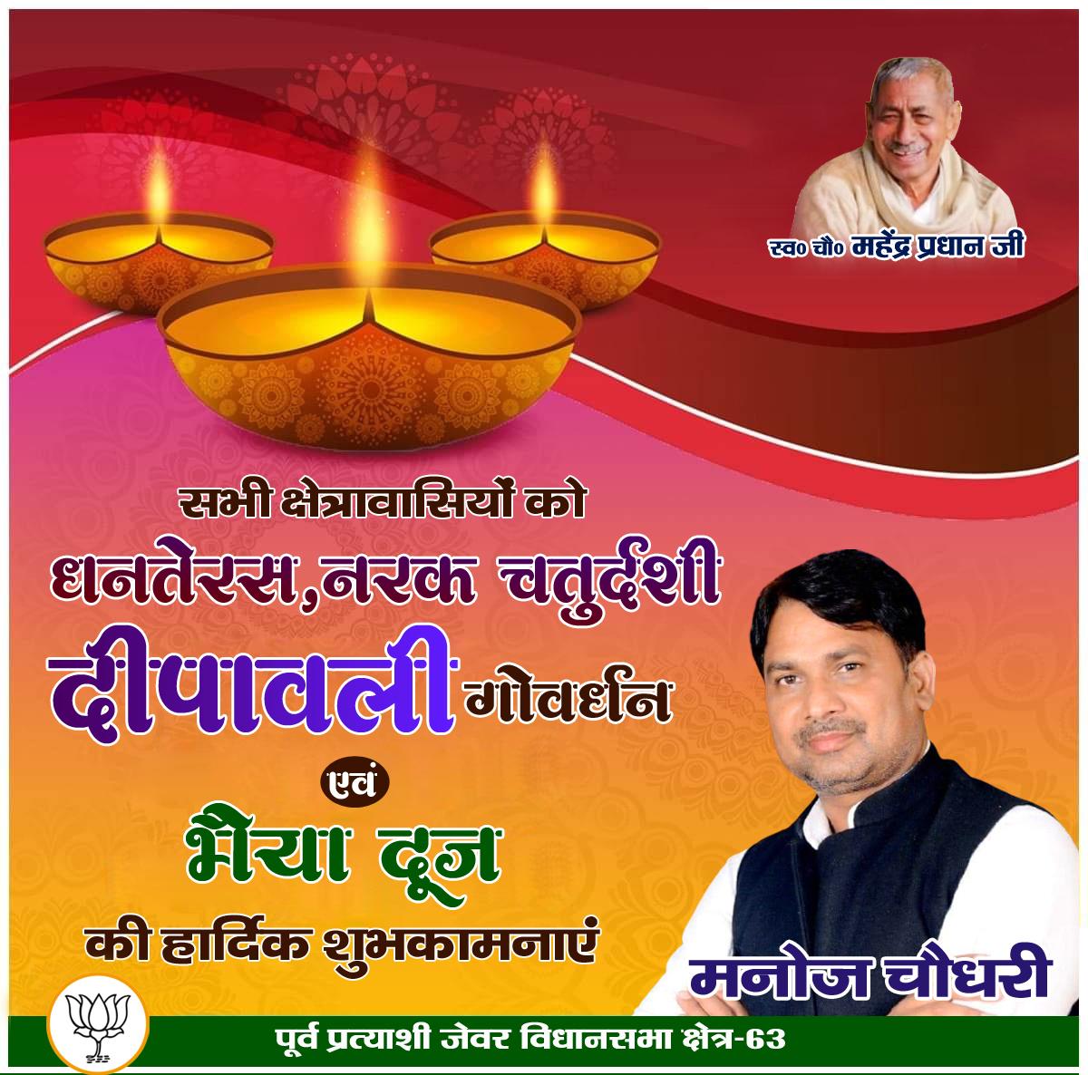 मनोज चौधरी पूर्व प्रत्याशी जेवर विधानसभा क्षेत्र-63 की ओर से धनतेरस, नरक चतुर्दशी,दीपावली, गौवर्धन और भैया दूज की सभी क्षेत्रवासियों की हार्दिक शुभकामनाए