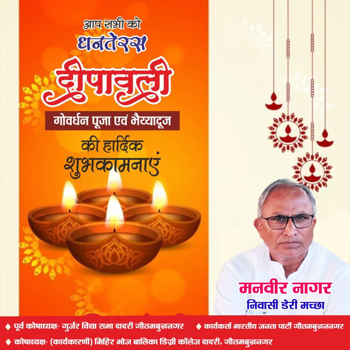 मनवीर नागर, निवासी डेरी मच्छा, कोषाध्यक्ष- कार्यकारणी मिहिर भोज बालिका डिग्री कॉलेज दादरी, गौतमबुद्धनगर, पूर्व कोषाध्यक्ष गुर्जर विद्या सभा दादरी गौतमबुद्धनगर/ कार्यकर्ता भारतीय जनता पार्टी गौतमबुद्धननगर की ओर से धनतेरस, नरक चतुर्दशी,दीपावली, गौवर्धन और भैया दूज की सभी क्षेत्रवासियों की हार्दिक शुभकामनाए