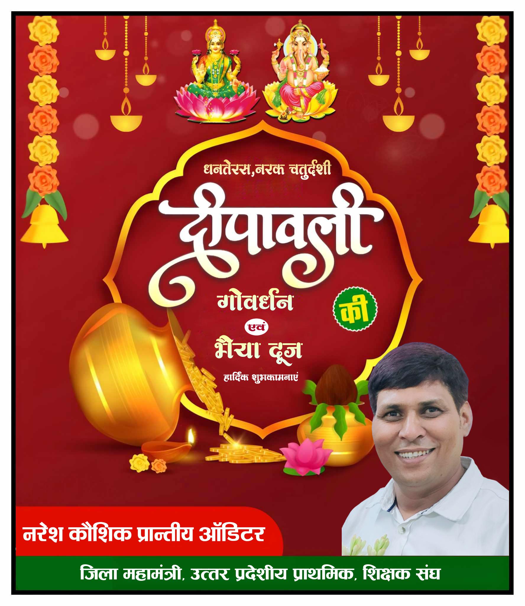 नरेश कौशिक- प्रान्तीय ऑडिटर/ जिला महामंत्री, उत्तर प्रदेशीय प्राथमिक, शिक्षक संघ की ओर से धनतेरस, नरक चतुर्दशी,दीपावली, गौवर्धन और भैया दूज की सभी क्षेत्रवासियों की हार्दिक शुभकामनाए