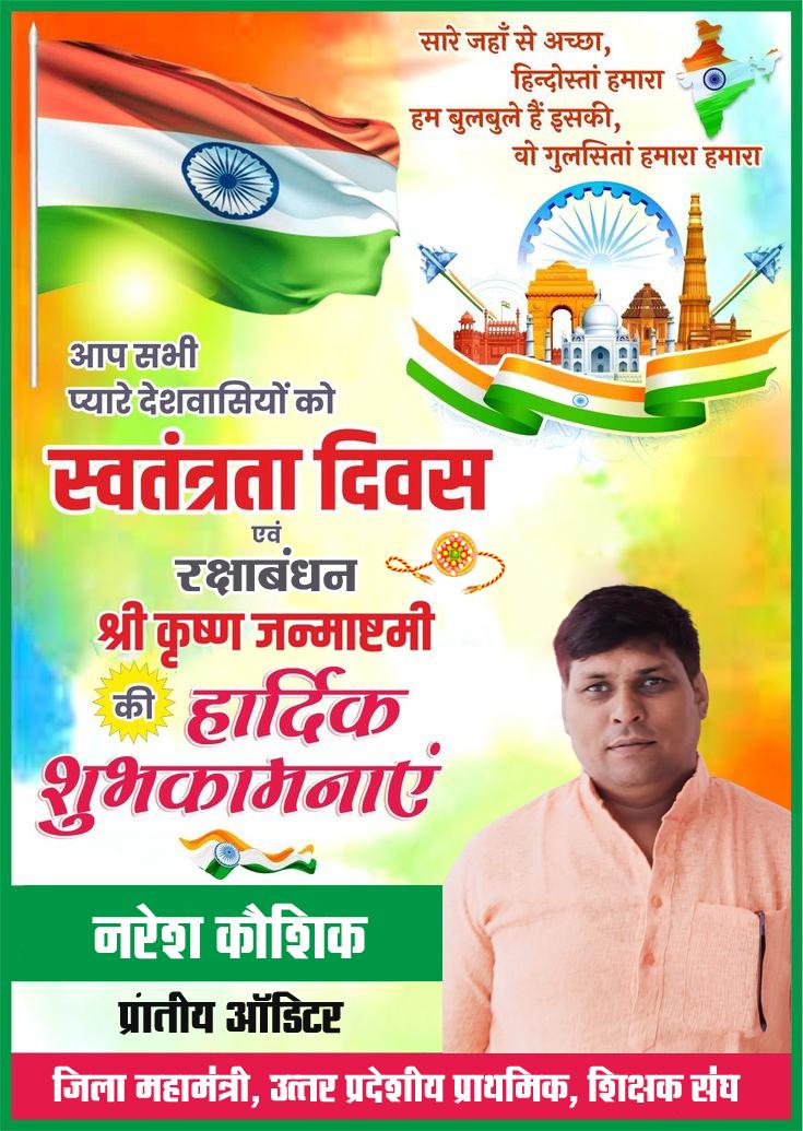 नरेश कौशिक प्रांतीय ऑडिटर/ जिला महामंत्री, उत्तर प्रदेशीय प्राथमिक, शिक्षक संघ की ओर से सभी क्षेत्रवासियों को स्वतंत्रता दिवस, रक्षाबंधन और श्री कृष्ण जन्माष्टमी की हार्दिक शुभकामनाएं