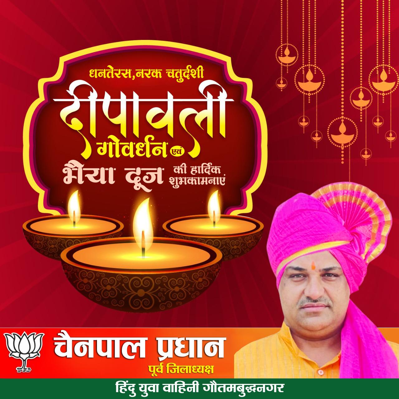 चैनपाल प्रधान पूर्व जिलाध्यक्ष हिंदु युवा वाहिनी गौतमबुद्धनगर की ओर से धनतेरस, नरक चतुर्दशी,दीपावली, गौवर्धन और भैया दूज की सभी क्षेत्रवासियों की हार्दिक शुभकामनाए
