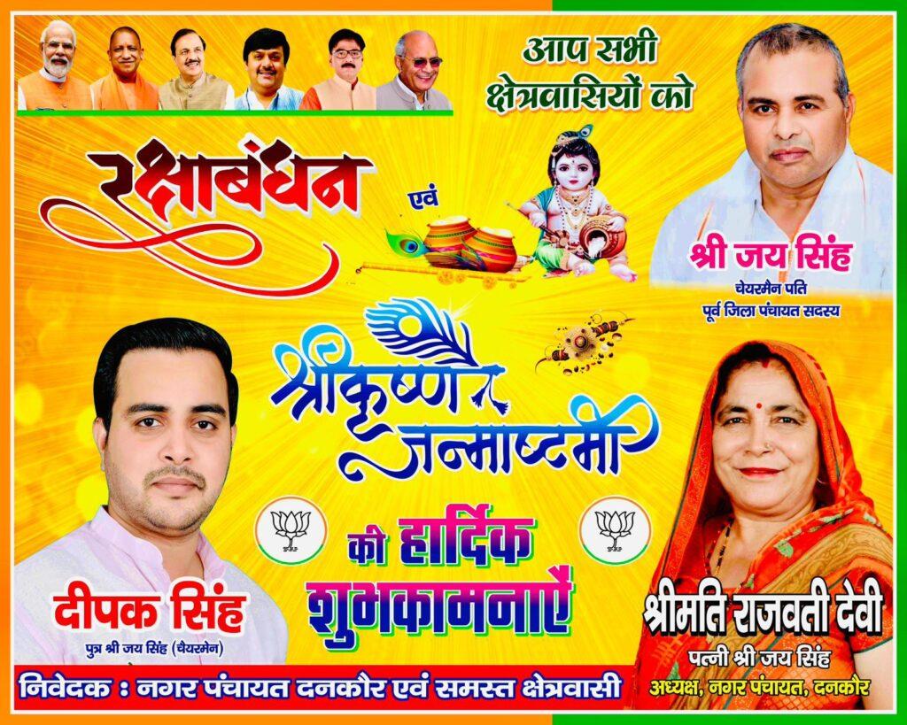 दनकौर चैयरमैन श्रीमती राजवती देवी/ प्रतिनिधि दीपक सिंह उर्फ दीपक भैया की ओर से रक्षाबंधन और श्री कृष्ण जन्माष्टमी की सभी क्षेत्रवासियों को हार्दिक शुभकामनाएं