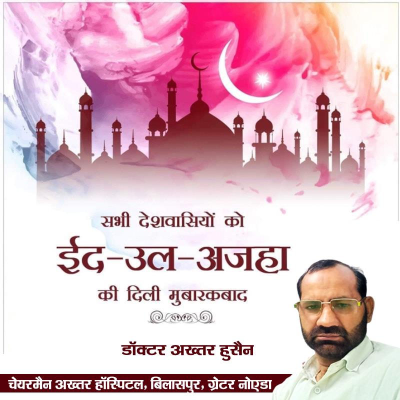 डॉक्टर अख्तर हुसैन, चेयरमैन अख्तर हॉस्पिटल, बिलासपुर, ग्रेटर नोएडा की ओर से ईदुल- अजहा (बकरीद) की सभी क्षेत्रवासियों को हार्दिक शुभकामनाएं