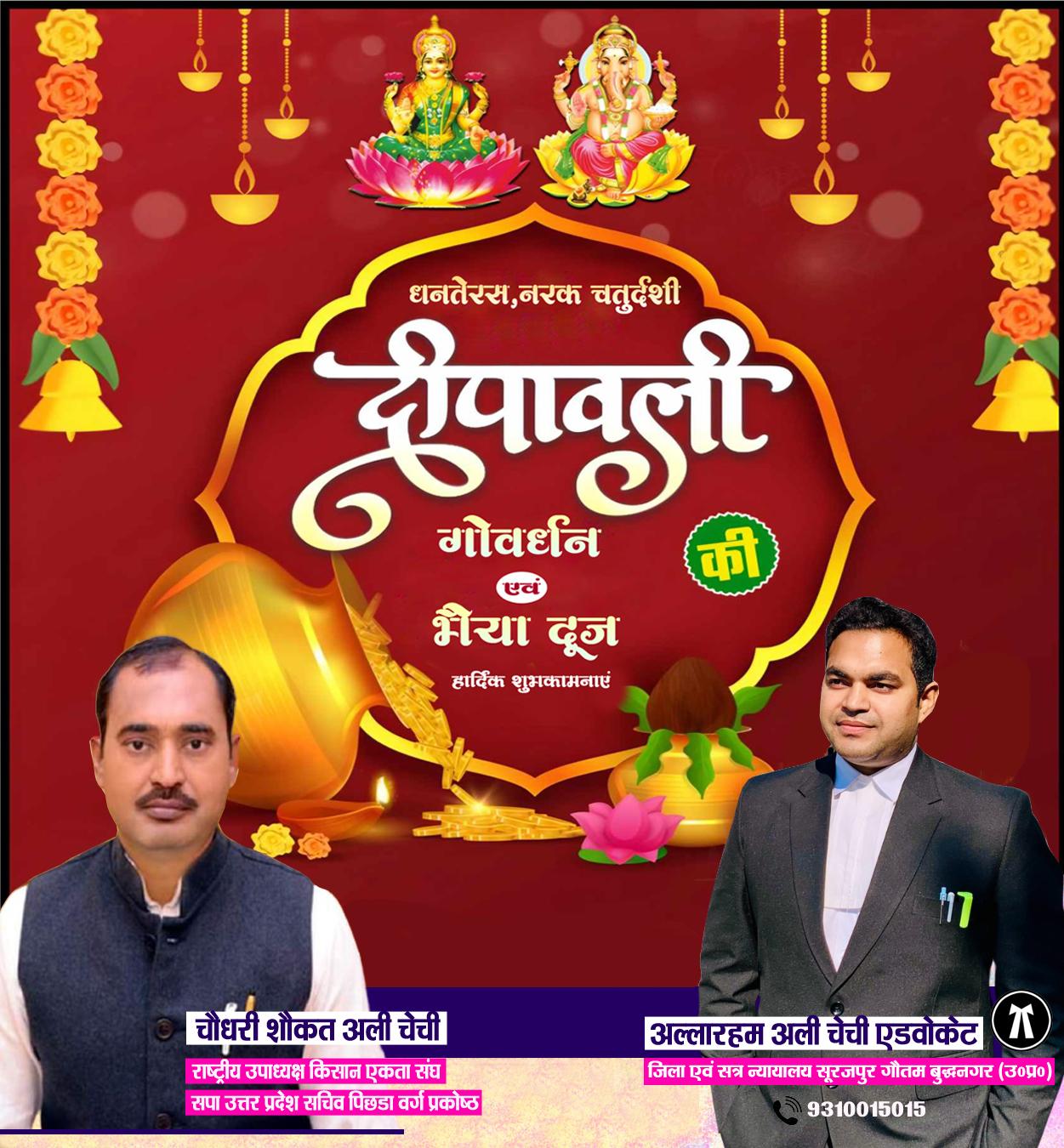 चौधरी शौकत अली चेची, राष्ट्रीय उपाध्यक्ष किसान एकता संघ/ सपा उत्तर प्रदेश सचिव पिछडा वर्ग प्रकोष्ठ/ एडवोकेट चौधरी अल्लारहम चेची, जिला एवं सत्र न्यायालय, सूरजपुर, गौतमबुद्धनगर की ओर से धनतेरस, नरक चतुर्दशी,दीपावली, गौवर्धन और भैया दूज की सभी क्षेत्रवासियों की हार्दिक शुभकामनाए