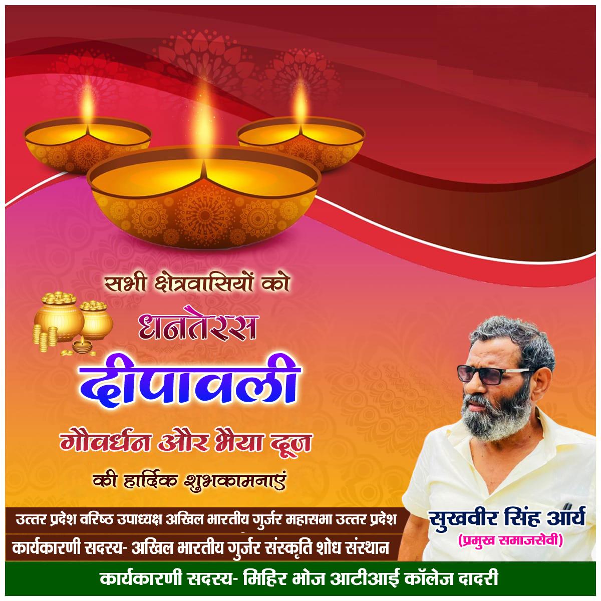 सुखवीर सिंह आर्य -प्रमुख समाजसेवी- उत्तर प्रदेश वरिष्ठ उपाध्यक्ष अखिल भारतीय गुर्जर महासभा उत्तर प्रदेश/ कार्यकारणी सदस्य- अखिल भारतीय गुर्जर संस्कृति शोध संस्थान/ कार्यकारणी सदस्य- मिहिर भोज आटीआई कॉलेज दादरी की ओर से धनतेरस, दीपावली, गौवर्धन और भैया दूज की सभी क्षेत्रवासियों की हार्दिक शुभकामनाए