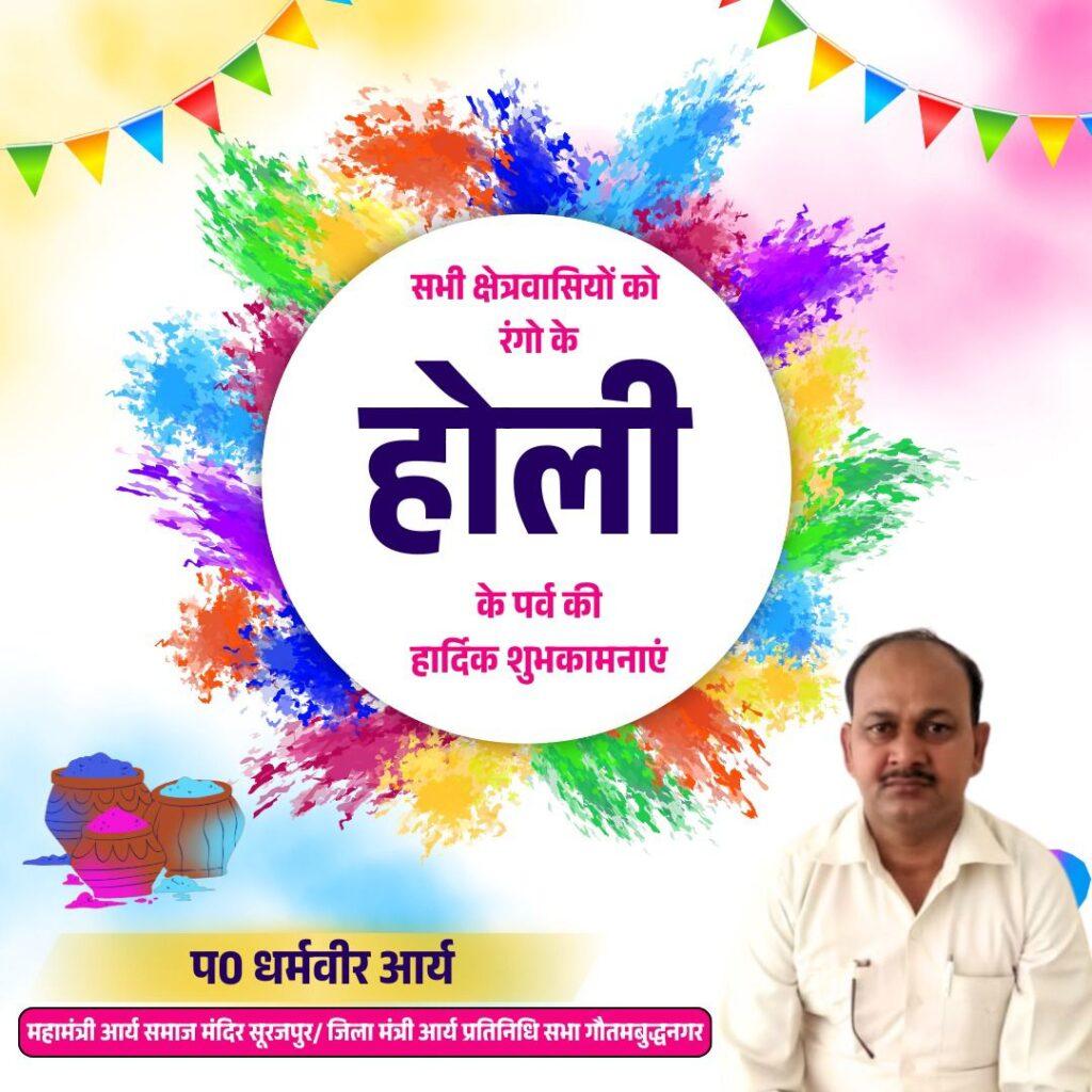 पंडित धर्मवीर आर्य महामंत्री आर्य समाज मंदिर सूरजपुर/ जिला मंत्री आर्य प्रतिनिधि सभा गौतमबुद्धनगर की ओर से रंगों के पर्व होली की सभी क्षेत्रवासियों को हार्दिक शुभकामनाएं