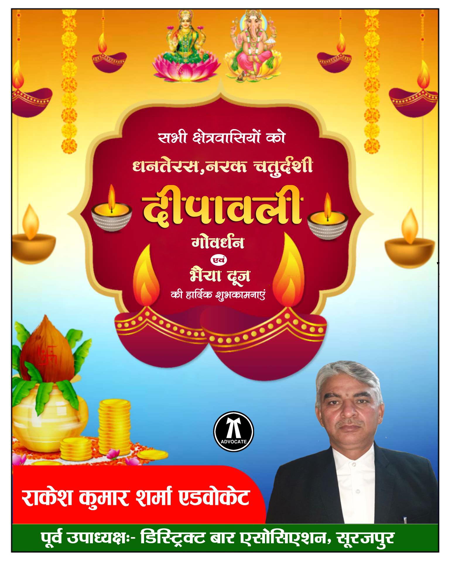 राकेश कुमार शर्मा एडवोकेट, पूर्व उपाध्यक्षः- डिस्ट्रिक्ट बार एसोसिएशन, सूरजपुर की ओर से धनतेरस, नरक चतुर्दशी,दीपावली, गौवर्धन और भैया दूज की सभी क्षेत्रवासियों की हार्दिक शुभकामनाए
