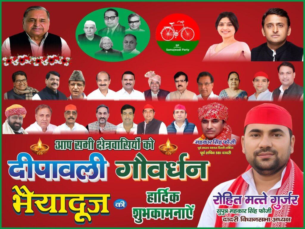 सभी क्षेत्रवासियों को धनतेरस, नरक चतुर्दशी, दीपावली, गोवर्धन और भैया दूज की हार्दिक शुभकामनाएं निवेदक :- रोहित बैसोया (रोहित मत्ते- भैया) 1:- अध्यक्ष- दादरी विधानसभा समाजवादी पार्टी 2:- जिला प्रवक्ता:- समाजवादी पार्टी गौतमबुद्धनगर