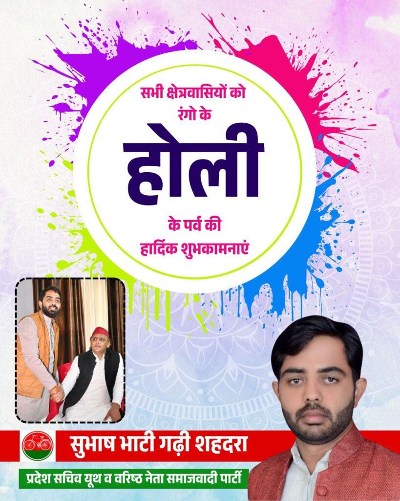 सुभाष भाटी (गढी शहदरा नोएडा)- प्रदेश सचिव यूथ व वरिष्ठ नेता समाजवादी पार्टी की ओर से रंगों के पर्व होली की सभी क्षेत्रवासियों को हार्दिक शुभकामनाएं