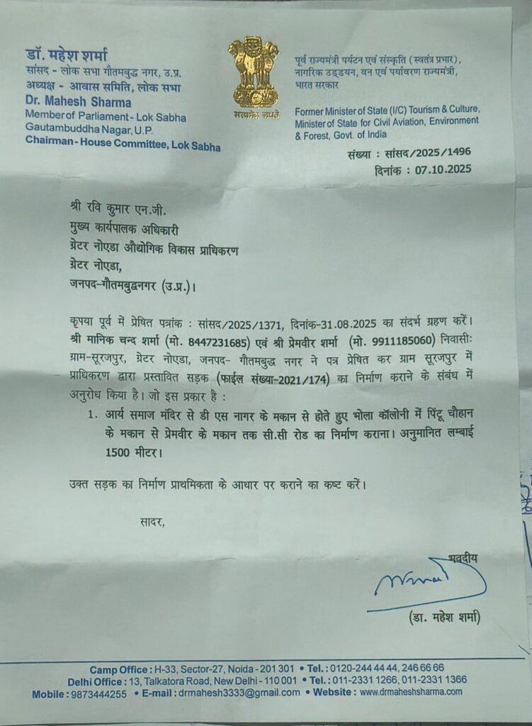 इसी क्रम में सांसद डॉ. महेश शर्मा ने भी पत्रांक सांसद/2025/1496 दिनांक 07.10.2025 के माध्यम से सीईओ रवि कुमार एन.जी. को पत्र भेजा है। उन्होंने अपने पूर्व पत्र (दिनांक 31 अगस्त 2025) का संदर्भ देते हुए कहा कि ग्राम सूरजपुर में आर्य समाज मंदिर से होकर भोला कॉलोनी में पिंटू चौहान से प्रेमवीर शर्मा के मकान तक 1500 मीटर लंबी सीसी रोड का निर्माण कार्य प्राथमिकता के आधार पर कराया जाए। सांसद ने स्पष्ट कहा कि यह मार्ग स्थानीय जनता की दैनिक जरूरत और सार्वजनिक आवाजाही के लिए अत्यंत आवश्यक है।