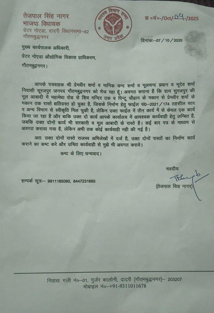विधायक तेजपाल नागर ने अपने पत्र में कहा है कि दोनों सड़कें राजस्व अभिलेखों में दर्ज सरकारी मार्ग हैं, जिनका निर्माण कार्य तत्काल कराया जाना आवश्यक है। उन्होंने प्राधिकरण से आग्रह किया है कि लंबित कार्यों को शीघ्र पूरा कर जनता की सुविधा सुनिश्चित की जाए और कार्यवाही से उन्हें भी अवगत कराया जाए